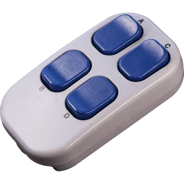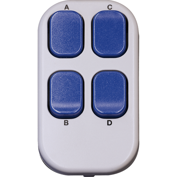Petit émetteur portable ergonomique conçu comme une télécommande mobile. L'émetteur peut être utilisé pour tous les récepteurs ALADIN. Pour la commutation et la variation de l'éclairage. Pour la commande de stores (avec le réglage des lamelles), de volets et de vénitiennes. Pour ouvrir/fermer les portes de garage et allumer l'éclairage individuel d'accueil. Fonctionne sans entretien et sans batterie. Diverses fonctions peuvent être réglées sur le récepteur. Un anneau peut être fixé à l'arrière, par exemple pour attacher un ruban. Les couleurs: le boîtier gris clair et les boutons bleu.