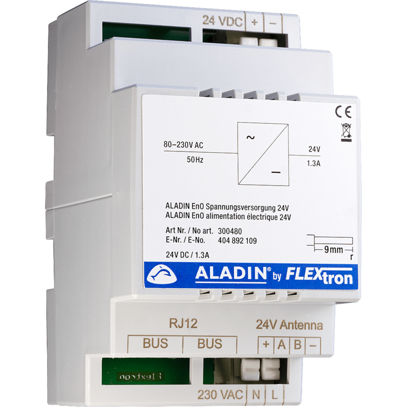 Module d'alimentation électrique (ALT) pour le ALADIN BUS du système AMD. Chaque alimentation peut alimenter modules jusqu'à 1300 mA max. Connexion radio sécurisée même dans les grands bâtiments, car un nombre importants de modules d'antenne peuvent être connectés en série au système AMD par le BUS d'antenne (câble G51).