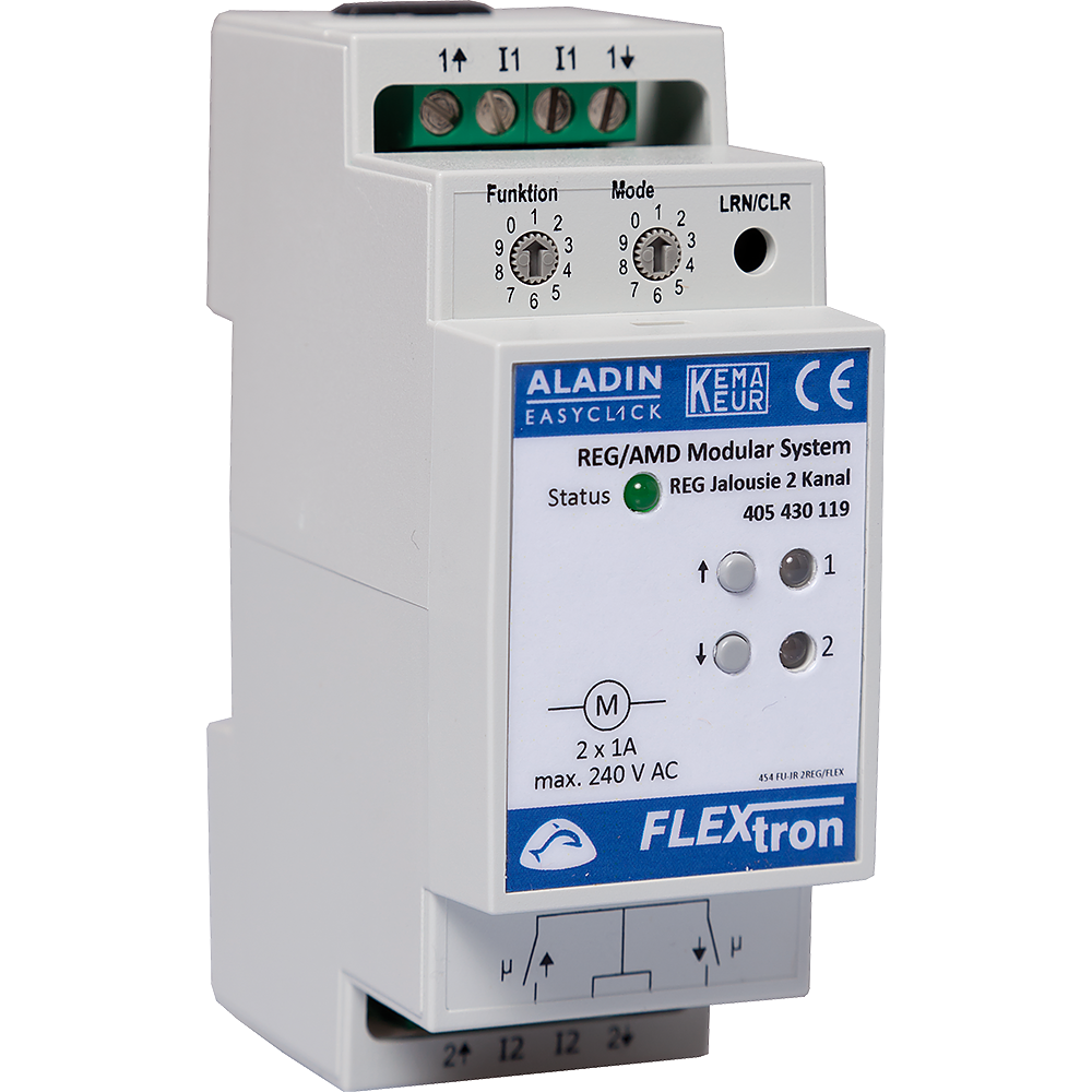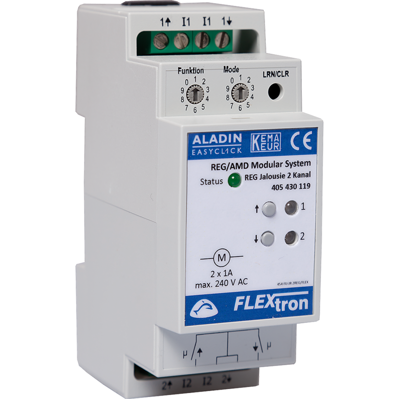 Module de volet 2 canaux pour la commande de 2 moteurs de stores, volets et de volets roulants, sans alimentation (ALT) pour le BUS interne. Module d'extension (2UM). Le REG peut être utilisé pour le contrôle dans de nombreuses applications différentes. Il est à installer dans une armoire électrique (rail DIN). Jusqu'à 128 modules AMD divers, ou modules d'antenne, peuvent être facilement combinés par le BUS du module (connecteur RJ45). Connexion radio sécurisée même dans les grands bâtiments, car un nombre importants de modules d'antenne peuvent être connectés en série au système AMD par le BUS d'antenne (câble G51).